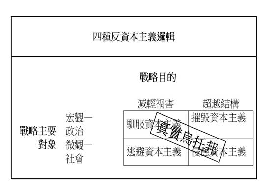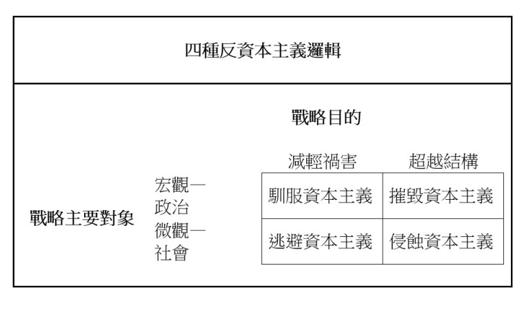 这四种逻辑同时存在也相互影响,但它们各自代表了一种响应资本主义祸害的独特方式。这四种反资本主义可说是由两种面向交互组成。