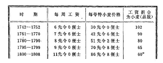 “下表说明了〈可是“十七世纪中叶至十八世纪中叶[实际]工资上涨了,因为谷物价格在这个时期至少下跌了35%”〉最近70年农业工人的工资和谷物价格之比。