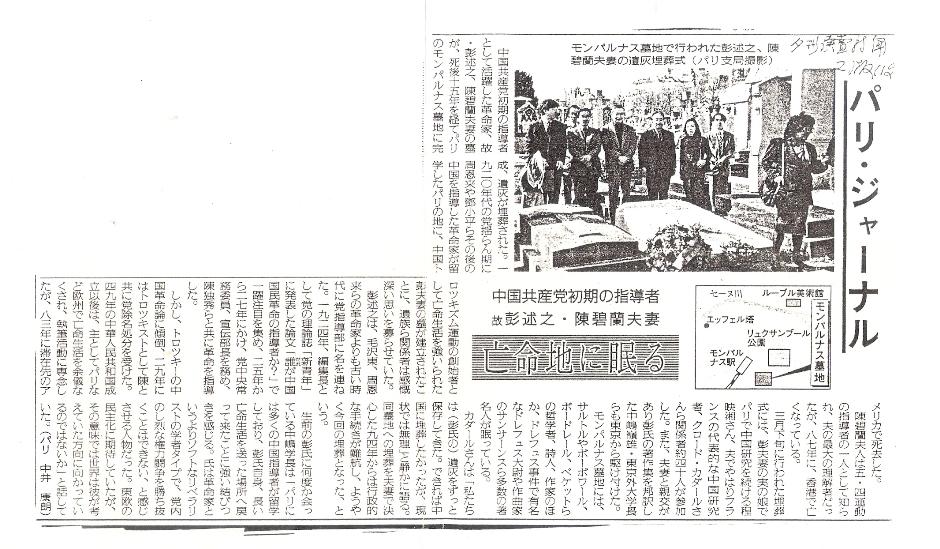 作为中国共产党早期领导人而活跃的革命家——已故的彭述之、陈碧兰夫妻——之墓终于在其逝世十五年之后于蒙那帕斯墓园建成,其骨灰被安置于内。与死者有关系的亲人等感慨:之后领导中国革命的周恩来和邓小平在一九二○年代党飘摇不定的那个时代来的就是巴黎,而作为中国托洛茨基主义运动的创始人、被迫亡命的彭氏夫妻的墓居然也建在这里。