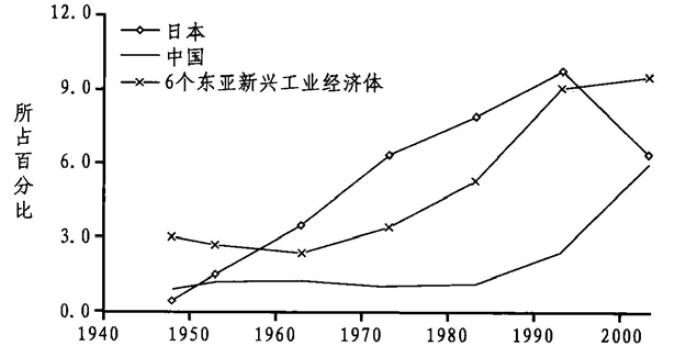 在“黄金时代”,进口竞争日益激烈是显而易见的,但是日本是个例外。1974年后,它一直稳定地占有欧洲2倍的进口市场份额,是美国的3倍多。这些竞争大多数来自于一些OECD成员国。虽然从南部进口产品发展也很迅速,占美国国内市场近1/10,但在其他发达国家却很少,因为中国占有主导地位。