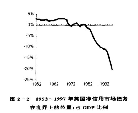 图2-2 1952~1997年美国净信用市场债务在世界上的位置;占GDP比例