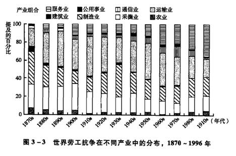 [4] 从图3-3可以看出,从20世纪60年代开始,服务业中劳工抗争数量所占比重稳步提高(稍后会更详细地加以讨论),这使得运输业中劳工抗争所占比重在同一时期内出现稳步的相对下降趋势。