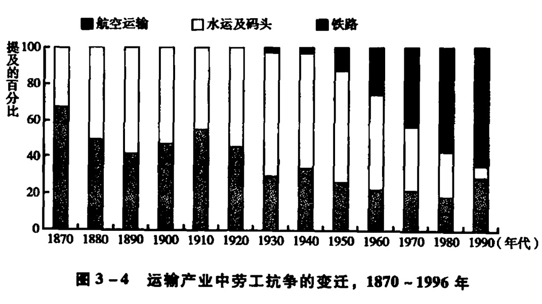 而且,正如图3-4中运输产业的三个子部门的劳工抗争分布情况所显示的,在整个20世纪里,运输业内部的劳工抗争数量所占比重的总体分布发生了一个转变。其中,最显著的是水运业相对于民航业劳工抗争的比重的变化。从1870年一直到1996年,水运业中的劳工抗争数量占运输行业的比重为52%,铁路业和民航业所占比重分别为35%和13%。而到了20世纪70年代,民航业劳工抗争数量所占的比重达42%,超过了同一时期水运业所占的35%的比重;此外,相对于码头和水运业,民航业劳工抗争数量的这种上升趋势一直延续到了20世纪80年代(民航业为55%,码头和水运业为24%)和20世纪90年代(民航业为63%,码头和水运业为7%)。铁路工人抗争的比重虽有所下降,但不是很剧烈,不过从图3-3仍然可以看出,其比例从20世纪上半叶的43%下降到了20世纪下半叶的25%。
