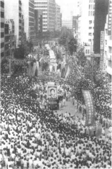 插图十 一场宏大的街头示威,与示威同时进行的为1987年6月被警察催泪瓦斯杀死的一名学生举行的葬礼,这是行进队伍(韩国《中央日报》提供)