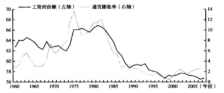 图9 -4 1960-2009年法国的通货膨胀率和工资份额