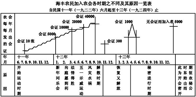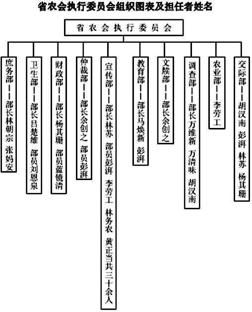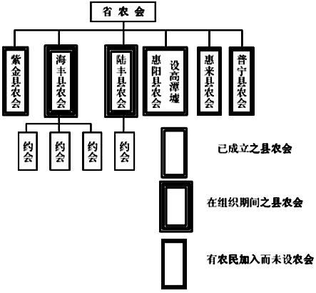 此时农会并发出有宣言(须待查检)及农会利益(须带查检),兼之无论何日何夜,我们必到乡村去宣传。到了十月份,加入农会会员每日平均有二十人了。由赤山约而平岗约,银镇约、青湖约、河口约、西河约、公平约、旧墟约……十余约,都成立了约农会,把县城东西南北都包围起来了。这个时候,我们就筹备海丰县总农会。 这个时候,农会就发起组织了一个济丧会,由会员自由加入,约百五十余人,无论那个会员的父母或自己死了,由各会员挪出两毫钱来济丧。此方法宣布后,第一日即有某会员的父亲死了,各会员挪出两毫钱,共约三十余元,同时会友并往致祭,行送丧的礼节,农民益加欢喜。到了第五日,又有会员的父亲死了,这个时候,济丧会的会友无法负担,乃先由农会代出,另日由济丧会筹还。到了第七日,又有一个会员死了,再由农会代出三十元。这个时候,济丧会会员吓了一惊,成立未十天而死者五六人,倘继续下去,如何办法呢?乃开全体会员大会,宣告临时停办,俟农会财政充裕时,始继续办理。 又办了一间农民医药房,在海丰大街,由一热心农民运动之西医生某君担任医生,凡农会会员有病须药者,准由该会员执会员证到来领药,药价仅收一半,非会员则全收。请诊症者如遇会员,不取诊费。并由该西医之老婆担任接生,凡遇会员不收接生费,仅取药费一半,大约二三角钱。自是领药接生者甚众。甚至有非会员而借会员证去领药者亦有之,乃在会员证中加数条规则以限制非会员借用,并规定会员证失落补领费二毫。 到了民国十二年,新历一月一日,乃海丰总农会成立大会,此时加入会员已达二万家户,以农会管辖下之人口计,有十万人[6],以全县人口比较,占全县人口四分之一。是日各乡代表到者共六十余人。开会秩序:(一)主席宣布开会理由,(二)各代表报告,(三)主席报告筹备经过,(四)演说,(五)选举,(六)讨论章程,(七)提议,(八)欢宴。结果选出彭湃为正会长,杨其珊为副会长,蓝镜清为财政,林沛为庶务,张妈安为调查……(其余忘记)。总农会之组织图表如下: